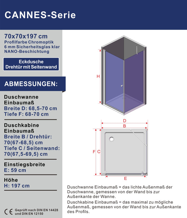 - 70x70x197 cm | Verstellbereich: Tür 70(67-68,5) cm x Seitenwand 70(67,5-69,5) cm | Einstiegsbreite: 59 cm