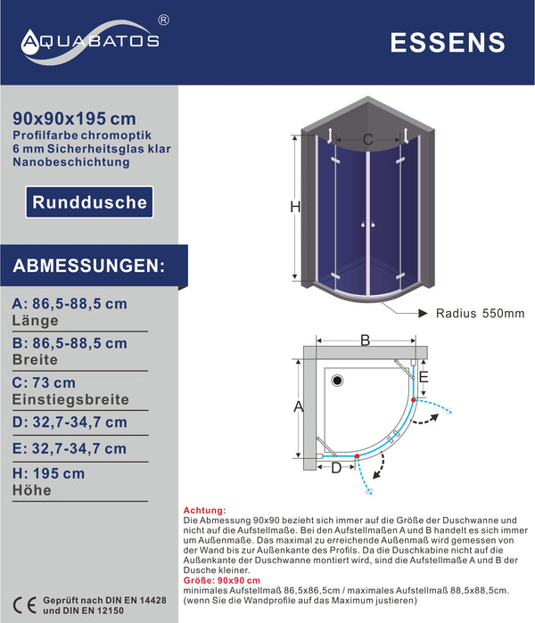 Achtung: Bei den Abmessungen handelt es sich immer um Außenmaße. Das maximal zu erreichende Außenmaß wird gemessen von der Wand bis zur Außenkante des Profils. Die Abmessung 90x90cm bezieht sich immer auf die Größe der Duschwanne und nicht auf die Aufstellmaße.