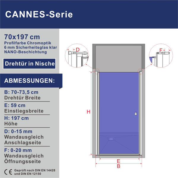 CANNES-Serie Duschtür Nische rahmenlos Pendeltür Dusche Drehtür Schwingtür Höhe 197 cm