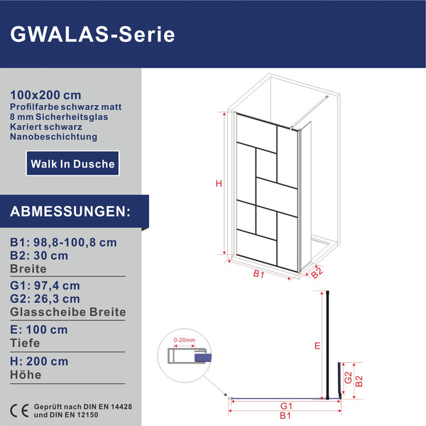 GWALAS-Serie Walk-in Dusche Schwarz matt Echtglas 8 mm Dekor Kariert mit 30 cm Spritzschutz Seitenteil 90° Stabilisator