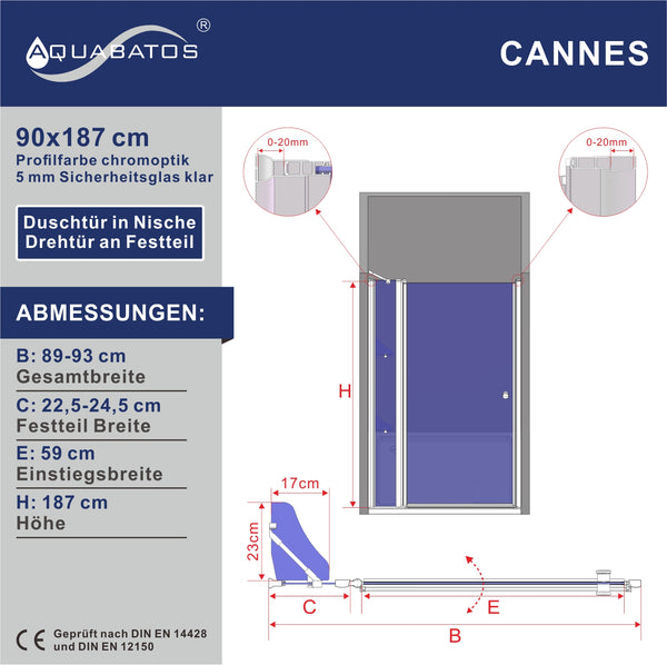 CANNES-Serie Duschtür mit Festteil Drehtür an Festteil in Nische Höhe 187 cm