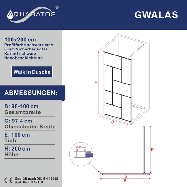 GWALAS-Serie Walk in Dusche schwarz matt Echtglas 8 mm Dekor Kariert Nano Beschichtung 90° Stabilisator