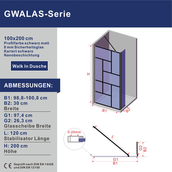 GWALAS-Serie Walk in Dusche Schwarz matt Echtglas 8 mm Dekor Kariert verstellbarer Winkel Stabilisationsbügel 30 cm Spritzschutz Seitenteil