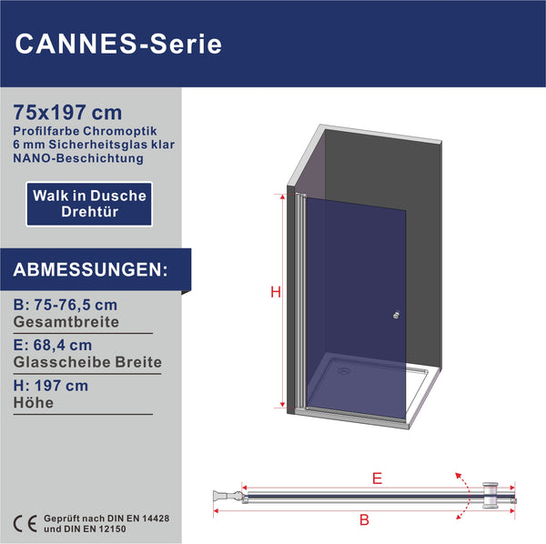 CANNES-Serie Walk in Dusche Duschwand Glas für Duschwanne mit Drehtür Schwingtür Höhe 197 cm