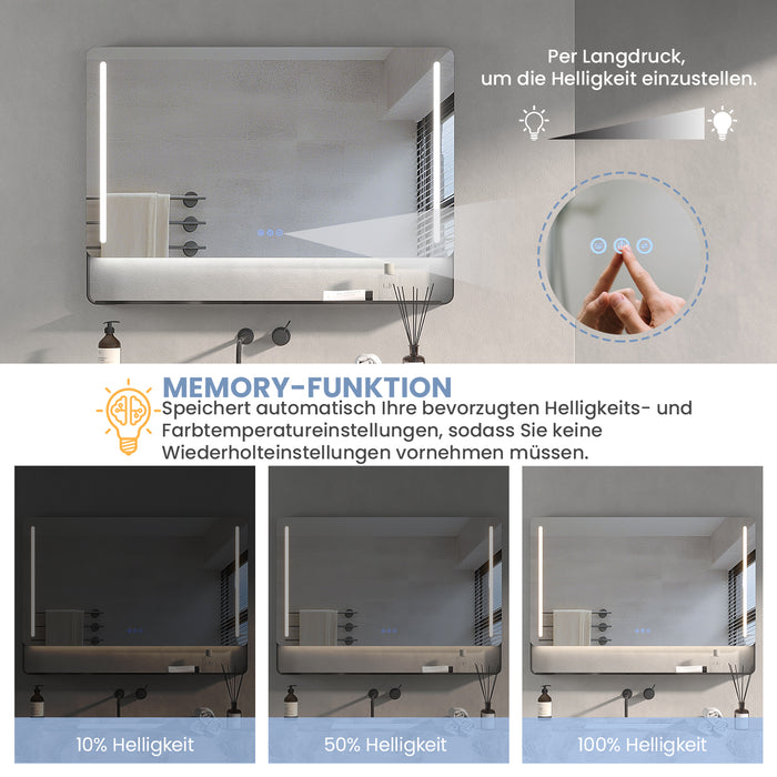 • 【Memory-Funktion】Der Dimmstatus kann gespeichert werden, auch wenn der Strom ausgeschaltet ist, sodass unsere Badezimmerspiegel direkt an eine vorhandene Stromquelle (z. B. eine Deckenleuchte) angeschlossen und über einen Wandschalter ein- und ausgeschaltet werden können.