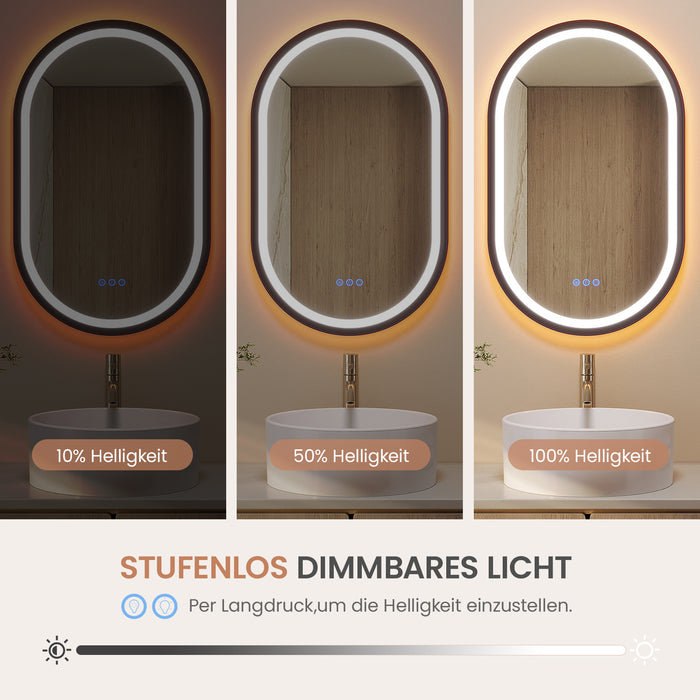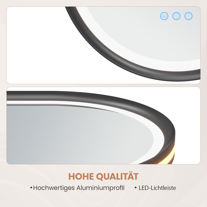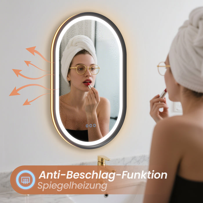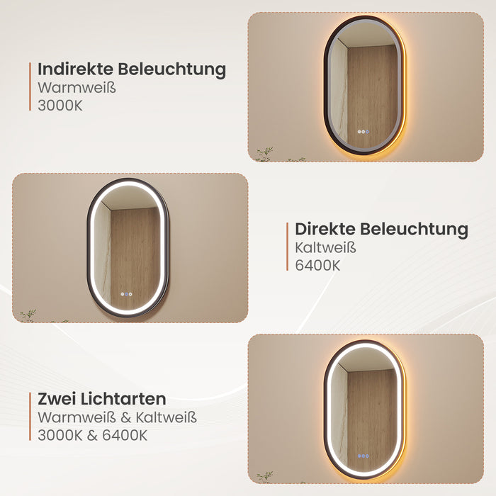 • EINZIGARTIGES BELEUCHTUNGS-DESIGN: Die Vorderseite dieses ovalen Spiegels ist mit kaltweißen LED-Lichtstreifen ausgestattet, die für eine helle Ausleuchtung sorgen. Die Seiten des Rahmens hingegen mit warmweißen LED-Lichtstreifen versehen, um eine gemütliche Atmosphäre zu schaffen.