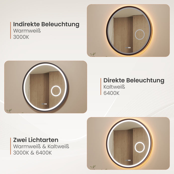 • EINZIGARTIGES BELEUCHTUNGS-DESIGN: Die Vorderseite dieses runden Spiegels ist mit kaltweißen LED-Lichtstreifen ausgestattet, die für eine helle Ausleuchtung sorgen. Die Seiten des Rahmens hingegen mit warmweißen LED-Lichtstreifen versehen, um eine gemütliche Atmosphäre zu schaffen.